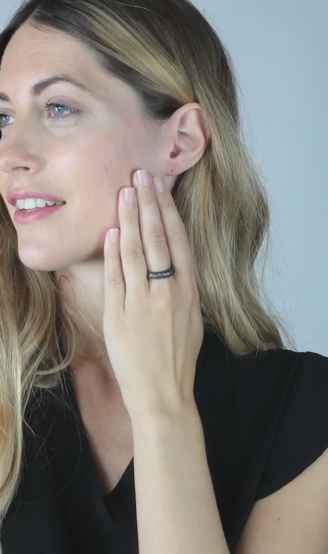 Recycled using oxidised sterling silver. As with all oxidised rings the colour can change with wear. For those seeking striking and unique beauty, it features an organically textured finish. Smoothed on the centre and sitting comfortably on the finger, this simple accessory can be worn on its own or easily pairs with rings of a similar style. A unique alternative, it has been handcrafted in our London workshop and uses only the highest quality materials in its construction. If you are a fan of this oxidised look, head over to the back in black collection for more designs in this style.